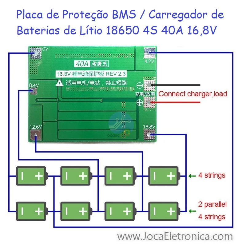 Inclui: 1 x Placa de Proteção BMS / Carregador de Baterias de Lítio 18650 4S 40A 16,8V.